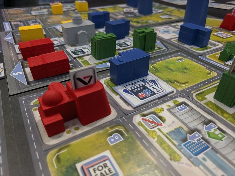 But while the players acquire more and larger properties, the price of land keeps rising higher and higher. Eventually, it becomes completely unsustainable and a game-ending crash that will destroy the value of players’ properties becomes inevitable. When exactly the crash happens, however, is shaped by the players: How much land they buy and how much property they sell will more make a crash on any specific turn more or less likely. Players must time their actions carefully to avoid substantial losses while maximizing their profits. Only then will they emerge victorious as the city’s wealthiest property magnate.